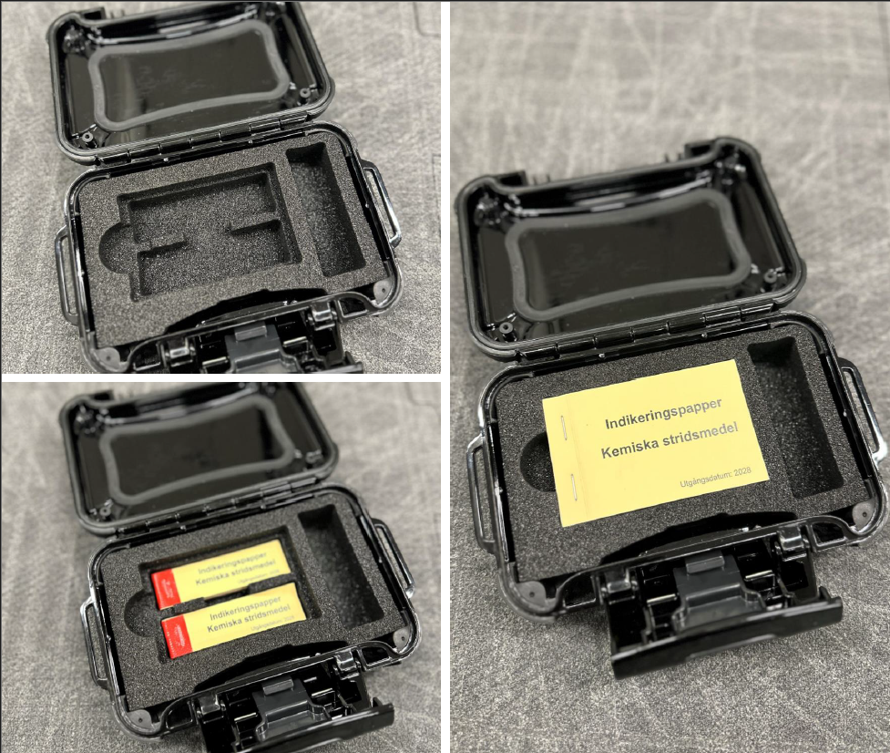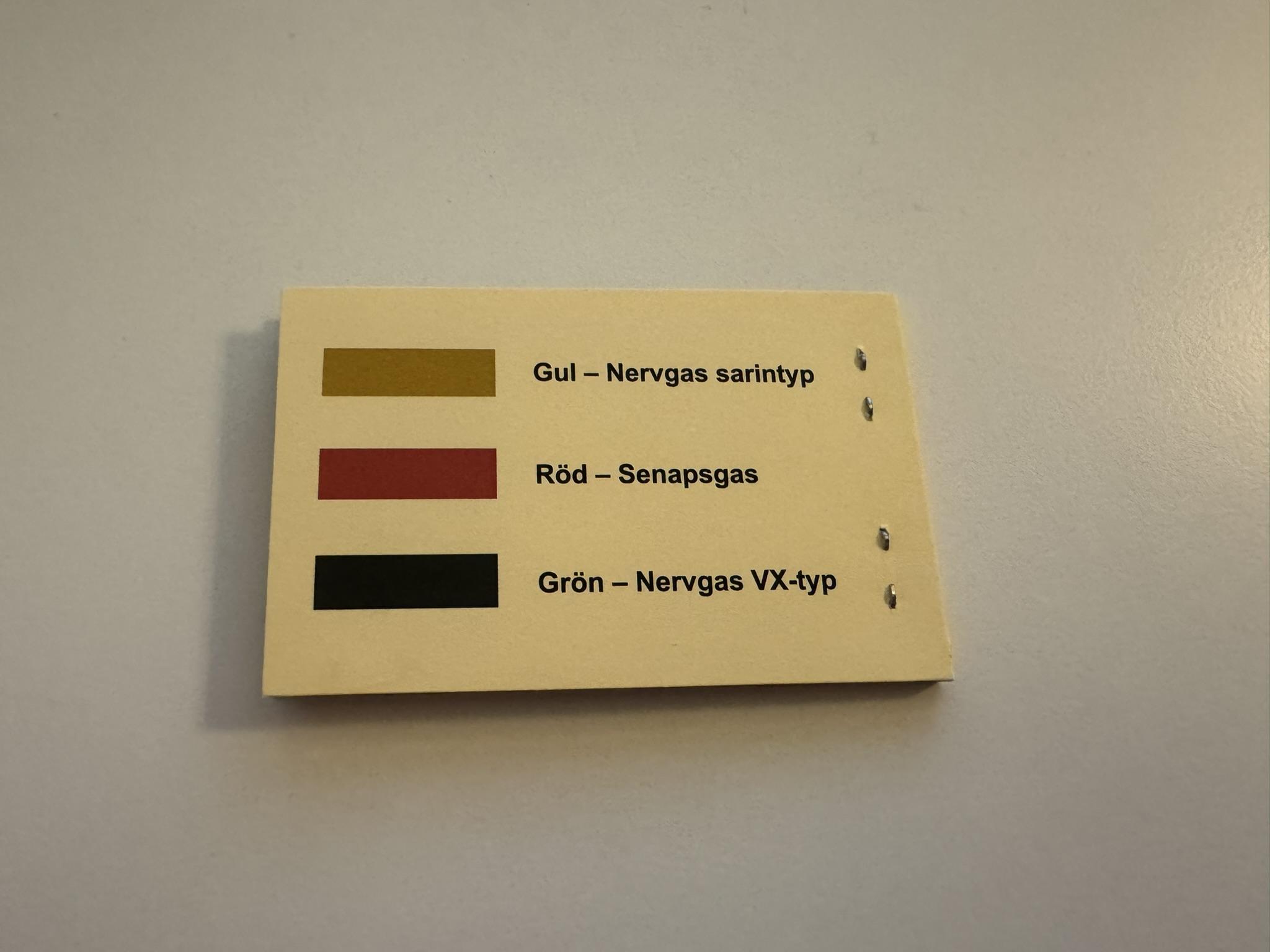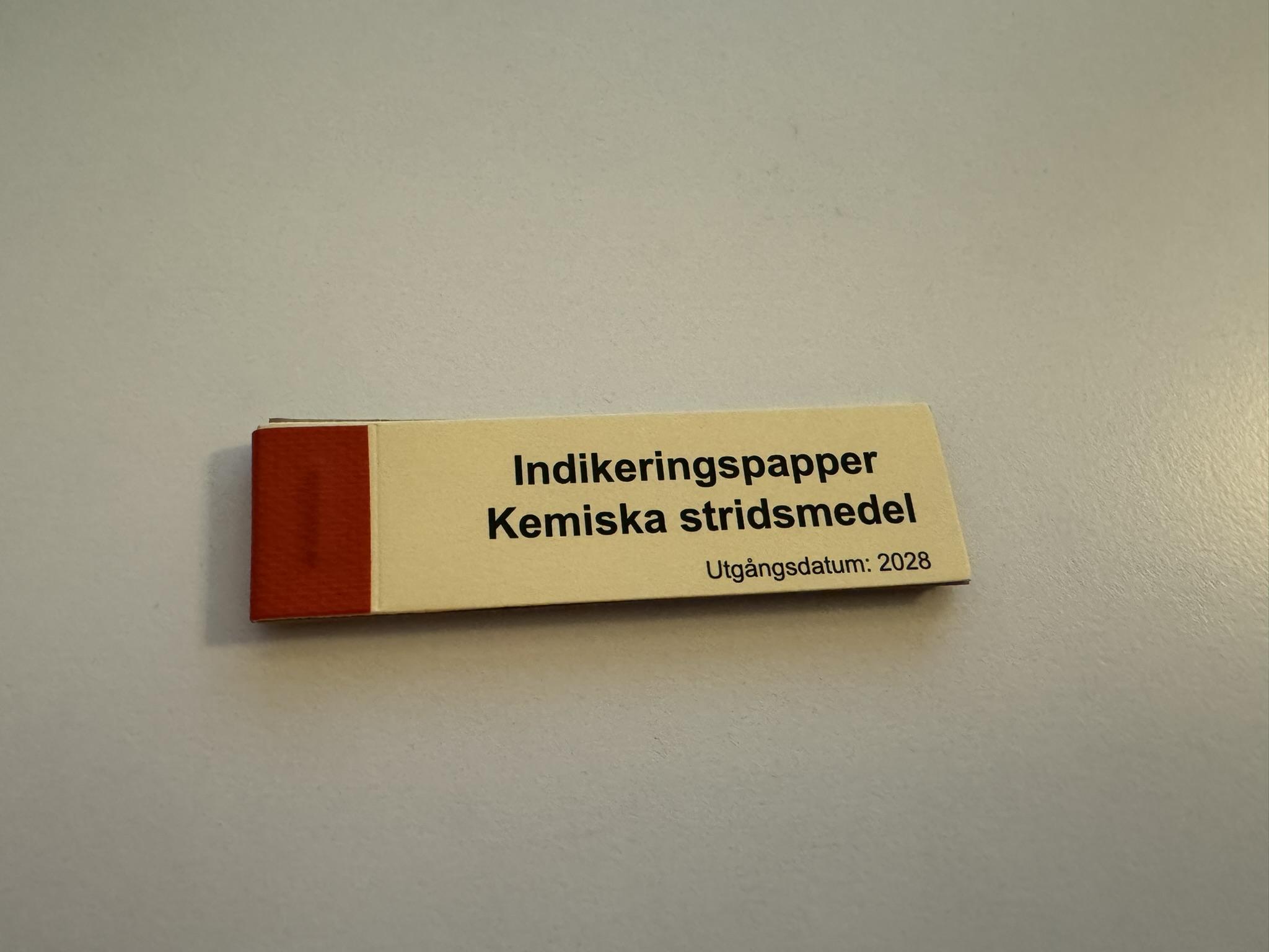Indikeringspapper för att detektera kemiska stridsmedel. Indikeringspappret byter färg inom några sekunder vid kontakt med skarpt ämne. Gult omslag indikerar nervgas av sarintyp. Rött omslag indikerar senapsgas. Grönt omslag indikerar nervgas av VX-typ.